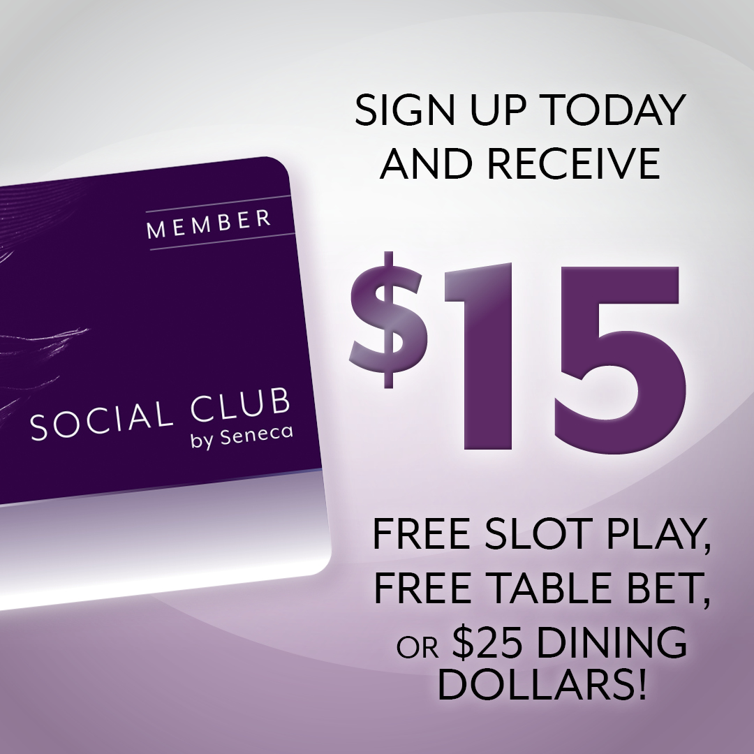 *Offer valid only on day of enrollment. Must be a newly enrolled Social Club by Seneca member. Must be 21 years or older to register for a Social Club card at Seneca Niagara Resort & Casino, Seneca Allegany Resort & Casino or Seneca Buffalo Creek Casino. Bus groups are not eligible to participate in New Member offer.